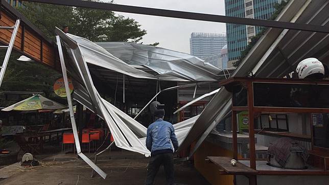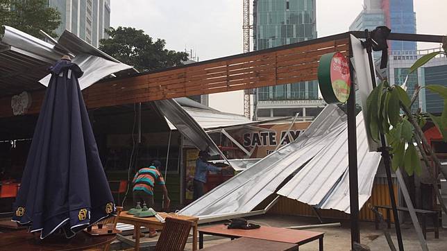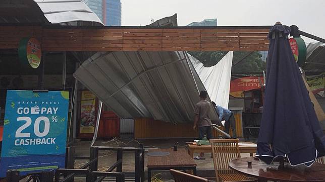 BANDARQ TERBAIK - Angin kencang serta hujan lebat yang melanda kawasan Epicentrum, Jakarta Selatan, membuat atap di food court Rasuna Garden terbang dihempas angin. Sedikitnya, ada 4 kios rusak akibat diterpa angin kencang.